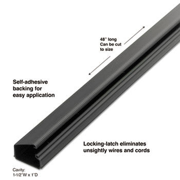 Eliminates unsightly clutter created by multiple wires and cords. Locking-latch keeps wires securely in place. Self-adhesive backing for easy application. Cable Management Type: 1" Locking Channel; Closure: Locking Latch; Color(s): Black; Length: 48".