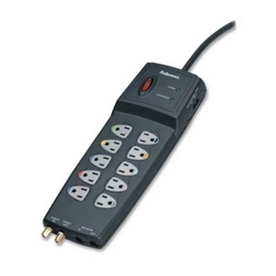 10 OT SURGE W/ PHN/RJ45/COAX 10FT CORD & CHILD SAFETY COVER GRAPHITE. Fellowes Surge Protector with 10 outlets protects your electronics from harmful surges. 3,300 joules, EMI/RFI noise filtering, illuminated on/off switch and 15-amp circuit breaker, LED indicator lights, and catastrophic fuse. Auxiliary DSL, phone, coaxial, and ethernet protection; includes 6? phone cord and coaxial cable. Color-coded swiveling safety covers. 10? power cord with right angle plug for easy cord management. $150,000 Connected Equipment Warranty. UL and cUL approved. BRAND : FELLOWES