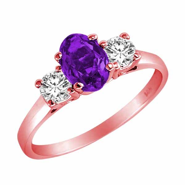 This dazzling sparkling timeless ring is classic and can be used as an engagement ring, anniversary ring, bridal ring, promise ring, proposal ring, fashion ring, wedding ring, cocktail ring and also to represent eternal love between you and that special someone.This 14K rose gold diamond ring is prong set with 2 round diamonds with a total carat weight of 0.40 carats and 1 oval amethyst gemstone with a total carat weight of 0.60 carats. The total carat weight of all the stones are approximately 0.95 carats. The diamonds are F-G color and SI1 clarity. The ring band measures approximately 1.80 mm wide and 1.0 mm thick. All our jewelry is shipped via FedEx Ground with a Certificate of Authenticity, jewelry polishing cloth, and jewelry box. BRAND : BRITNEY DIAMOND CLARITY : VS DIAMOND COLOR : F-G DIAMOND COUNT : 2 DIAMOND SETTING : PRONGS DIAMOND SHAPE : ROUND DIAMOND TCW : 0.45 GEM CATEGORY : AMETHYST GEM COUNT : 1 GEM SETTING : PRONGS GEM SHAPE : OVAL METAL : 14K ROSE GOLD SPECIAL : SEMI PRECIOUS JEWELRY