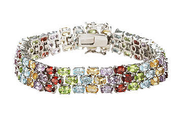 This awesone and stunning three rows bracelet surrounded on your wrist with mutiple colors of semi-precious stones oval faceted cut in prong-setting. Each stone size consists of 6X4 MM and the bracelet is 7 inches long with a lobster clasp. The entire bracelet is made in 14K white gold and has a total gem weight (TGW) of 19.00 carats.