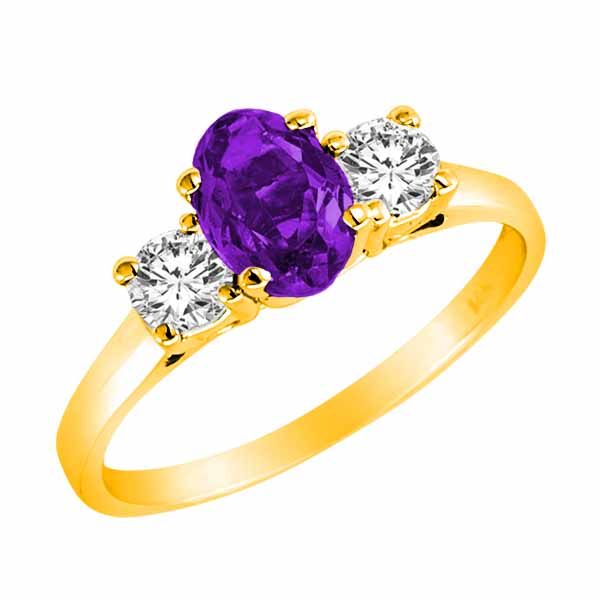 This dazzling sparkling timeless ring is classic and can be used as an engagement ring, anniversary ring, bridal ring, promise ring, proposal ring, fashion ring, wedding ring, cocktail ring and also to represent eternal love between you and that special someone.This 14K yellow gold diamond ring is prong set with 2 round diamonds with a total carat weight of 0.40 carats and 1 oval amethyst gemstone with a total carat weight of 0.60 carats. The total carat weight of all the stones are approximately 0.95 carats. The diamonds are F-G color and SI1 clarity. The ring band measures approximately 1.80 mm wide and 1.0 mm thick. All our jewelry is shipped via FedEx Ground with a Certificate of Authenticity, jewelry polishing cloth, and jewelry box. BRAND : BRITNEY DIAMOND CLARITY : VS DIAMOND COLOR : F-G DIAMOND COUNT : 2 DIAMOND SETTING : PRONGS DIAMOND SHAPE : ROUND DIAMOND TCW : 0.45 GEM CATEGORY : AMETHYST GEM COUNT : 1 GEM SETTING : PRONGS GEM SHAPE : OVAL METAL : 14K YELLOW GOLD SPECIAL : SEMI PRECIOUS JEWELRY