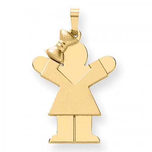 This Is a Flattering Girl Pendant Assembled of 14k Yellow Gold. This Reveals a Girl in Dress with Bow Ribbon and Arms Wide Open Symbol. This Pendant Is Done to a Rare Mirror Finish Metal. Pluck This Adorable Girl Pendant Now and Carve Your Own Fashion. Processing Time: 1 days. BRAND : GEMAFFAIR CHAIN TYPE : NO CHAIN TYPE CLASP TYPE : NO CLASP TYPE HEIGHT : 1 LENGTH : 29 METAL STAMP : 2.4 METAL TYPE : YELLOW GOLD METAL UNIT OF MEASURE : GRAMS TOTAL METAL WEIGHT : 14K UNIT OF MEASURE (DIMENSIONS) : MM WIDTH : 18