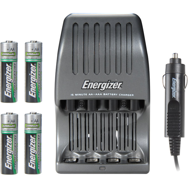 15 MIN BATTERY CHARGERW/4 2200 MAH BATT W/2 AA/2 AAA BATTS Charges up to 4 AA or 4 AAA NiMH batteries in 15 minutes Built-in safety timer and temperature sensorTrickle charge keeps batteries at full capacityCharge status indicator alerts when batteries are readyCompatible with all manufacturers' NiMH batteriesIncludes car adapter and two 2200mAh AA and two 900mAh AAA NiMH batteries BRAND : ENERGIZER