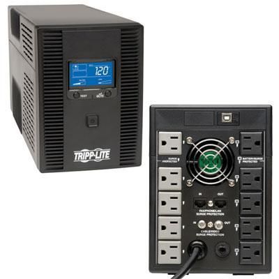 1500VA UPS LCD Battery Back Up Tower AVR 120V USB Coax RJ45. OMNI1500LCDT. Tripp Lite's OMNI1500LCDT Line-Interactive Tower UPS System offers voltage regulation, surge suppression and long-lasting battery support for personal computers, network workstations, home entertainment systems and media centers. Internal UPS circuits support entry-level PCs or individual VCR/DVR components during power failures. Prevents data loss, viewing interruptions, lost recordings and loss of component programming. Automatic Voltage Regulation (AVR) circuits continuously regulate brownouts and overvoltages from 92V to 150V back to usable levels, all while maintaining a full battery charge. Offers complete power protection in an attractive all-black cabinet design. Includes 10 built-in outlets, 5 with full battery backup and surge suppression for vital system components and another 5 with surge-suppression only for accessories not requiring battery support. Built-in USB port and included cable enables optional unattended system shutdown without data loss in case of extended power failure. PowerAlert software is available via free download from www.tripplite.com. HID-compliant USB interface also enables integration with built-in power management and auto shutdown features of Windows and Mac OS X. Built-in surge dataline surge suppression jacks protect equipment with single-line dialup/DSL or network Ethernet connection. Built-in audible alarm and large LCD front panel display offers easy to read icon-based status indicators and detailed numeric data regarding input voltage, output voltage, frequency, load percentage, load watts, battery voltage and runtime in minutes. 1500VA/810W power-handling capacity supports entry-level PCs, home entertainment systems, network workstations and audio/video components. BRAND : TRIPP LITE