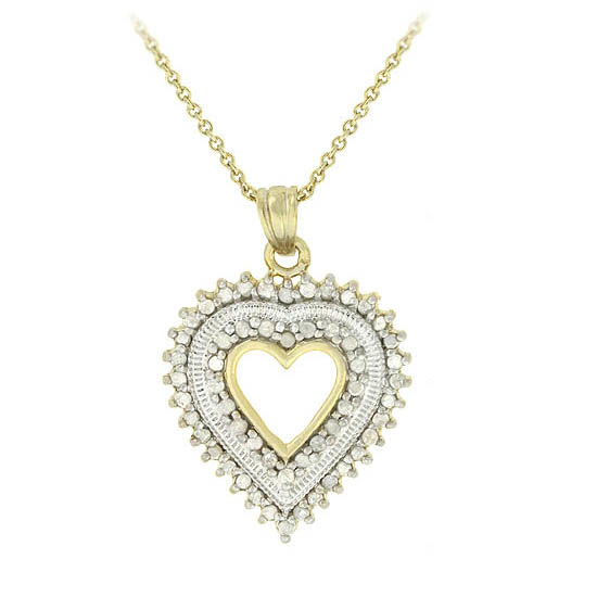 Product Description This romantic pendant is studded with 50 round genuine diamonds set in a heart crafted of 18k gold over sterling silver. The pendant dangles from an 18 chain also crafted of 18k gold over sterling silver. Total diamond weight is 1/2 carat. Product Details Metal Type: Yellow-gold-plated-silver Metal Stamp: 925-sterling Width: 19.32 mm Height: 24.22 mm Clasp Type: spring-ring Stone Details: diamond Stone Weight: 0.5 Shape: round-shape Color: IJ Clarity: I2-I3 Setting: prongs
