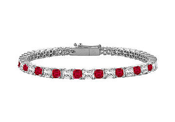 This never ending chain of alternating Rubies and princess-cut diamonds symbolizes your timeless love. Crafted in 18K white gold held in a prong setting this tennis bracelet has a total gem weight (TGW) of 4.00 carats. A great way to honor your union.