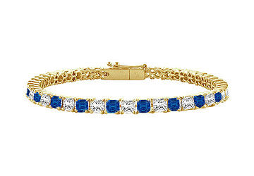 This never ending chain of alternating blue sapphires and princess-cut diamonds symbolizes your timeless love. Crafted in 18K yellow gold held in a prong setting this tennis bracelet has a total gem weight (TGW) of 4.00 carats. A great way to honor your union.