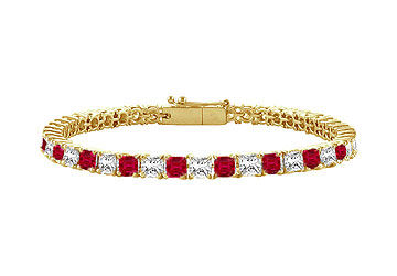 This never ending chain of alternating Rubies and princess-cut diamonds symbolizes your timeless love. Crafted in 18K yellow gold held in a prong setting this tennis bracelet has a total gem weight (TGW) of 5.00 carats. A great way to honor your union.