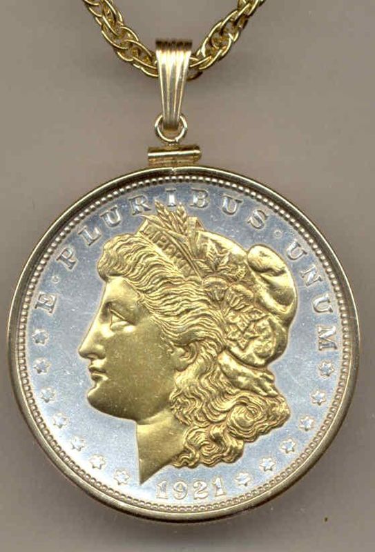 Each one of these old 1921 U.S Morgan Silver dollars (minted1878 - 1921) ( in Extremely fine condition) is first layered in pure Bright Silver. Then the figures of each are highlighted and brought to life with rich pure 24K Gold (this gold work is done by hand). This breathtaking and exclusive work turns these coin into stunning and true works of art. Each coin is hermetically sealed against wear in clear, hard acrylic coating. . Each coin comes mounted in a gold filled bezel (frame), on an 24 in. rope chain and placed in a nice jewelry box. Warranty 90 days BRAND : J&J Coin Jewelry