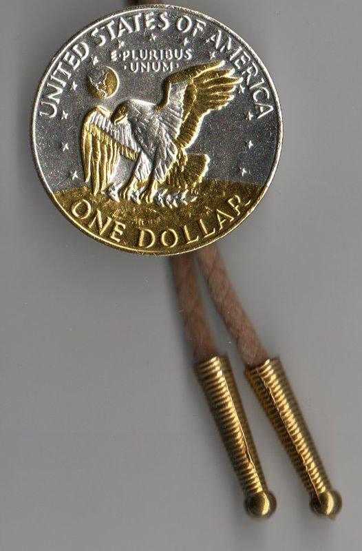 Each one of these new un-circulated U.S. Eisenhower dollar (eagle side) coins (minted 1971 - 1978) is first layered in pure Bright Silver. Then the figures of each are highlighted and brought to life with rich pure 24K Gold & Pure Silver (this gold & Silver work is done by hand). This breathtaking and exclusive work turns these coins into stunning and true works of art. Each coin is hermetically sealed against wear in clear, hard acrylic coating. Each one comes on a nice (soft) bolo cord and nicely boxed. Warranty 90 days BRAND : J&J Coin Jewelry