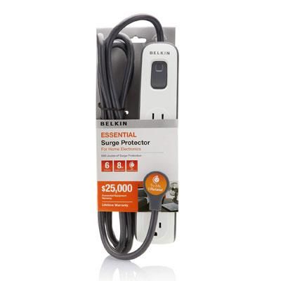 6-outlet Surge Protector with 8ft Power Cord and 360 Swivel Plug. The Essential Surge Protector safeguards your home electronics against harmful power fluctuations and secures your everyday power needs. Get complete protection for cell-phone chargers, radios, answering machines, and other home essentials. BRAND : BELKIN