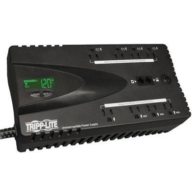 The ECO650LCD ultra-compact green UPS offers complete protection from blackouts, voltage fluctuations and transient surges. Interactive LCD user interface offers detailed UPS and site electrical data, including input/output voltage, estimated runtime remaining, load percentage, load wattage and battery charge level. Energy saving ECO outlets give users the option to automatically power off unused desktop accessories like a printer and audio speakers as the computer connected via USB goes to low-power sleep or shutdown modes. 99% full load efficiency rating offers energy savings and cool operating temperatures. Green eco-friendly design meets strict RoHS environmental standards. Provides uninterruptible transfer to battery derived AC output during power failures and voltage fluctuations with enough runtime to save and shutdown connected equipment without data loss. Space saving, ultra-compact desktop or wall mount compatible housing. Includes 4 battery supported outlets for computer, monitor and two vital system accessories, plus 4 additional surge suppression-only outlets for accessories not requiring battery support. Three surge-only outlets marked ?ECO? can be configured to automatically power-off within 3 minutes of the connected computer entering sleep or shutdown mode. USB port monitors computer power status for ECO power savings and enables direct integration with built-in power management and auto-shutdown features of Windows and Mac OS X. PowerAlert software is also available via free download from www.tripplite.com to provide advanced auto-shutdown, UPS monitoring and data saving options. USB cable included. Built-in single line RJ11 phone suppression protects modem, fax machine, cordless phone or other accessories with a dial-up/DSL phone connection. Built-in interactive LCD screen offers continuous power and UPS status information. Audible alarm warns of power failure conditions. Self-test, display brightness, alarm disable and LCD information display scrolling options are controllable via interactive LCD user interface. 650VA / 325 watt UPS capacity supports entry-level PC systems for up to 17 minutes during power fail conditions. 3 year warranty. $100,000 connected equipment insurance (USA, Puerto Rico, & Canada Only). Key Features ECO650LCD power saving, green UPS offers complete protection from blackouts, voltage fluctuations and transient surges Interactive LCD user interface with scroll and select buttons offer detailed UPS status and control options LCD screen options support continuous display of Input voltage, Output voltage, Estimated runtime, Load percentage, Load wattage and Battery charge percentage ? with the option to continuously scroll all six information fields LCD screen with scroll and select functions also gives users the ability to enable and disable specific UPS features, such as the ECO energy-saving feature, permanent alarm silence, LCD brightness, information display scroll functions and UPS self-test operation Set of 3 optional ECO outlets automatically power off unnecessary computer accessories like a printer, scanner and audio speakers three minutes after computer enters sleep or shutdown mode Full load efficiency rating of 99% saves energy and ensures cool operating temperatures ECO650LCD emits only 17 BTU/hr. and consumes less than 4 watts once the battery is charged Eco-friendly design meets strict RoHS (Restriction of Hazardous Substances) environmental standards 650VA / 325 watt UPS provides battery-derived AC output during power failures and severe voltage fluctuations to support an entry level desktop computer up to 17 minutes Ultra compact UPS supports a variety of placement options for desktop or wall mount installation Includes 4 UPS supported outlets for computer, monitor and two additional vital system peripherals requiring continuous power Includes 4 Surge-only outlets for accessories not requiring battery support Three of the Surge-only outlets are designated ECO outlets that can be configured to automatically power-off three minutes the connected computer enters low power standby or shutdown mode USB port monitors computer power status for ECO power savings and enables direct integration with built-in power management and auto-shutdown features of Windows and Mac OS X PowerAlert software is also available via free download from www.tripplite.com to provide advanced auto-shutdown, UPS monitoring and data saving options Single line RJ11 phone suppression jacks protect modem, fax machine, cordless phone or other accessories from surges on dial-up/DSL phone connections USB cable included Space-saving right angle input plug 3 year standard warranty with $100,000 connected equipment insurance (USA, Puerto Rico & Canada only) Package Includes ECO650LCD UPS System USB cable Instruction manual Warranty 8.1 BRAND : TRIPP LITE