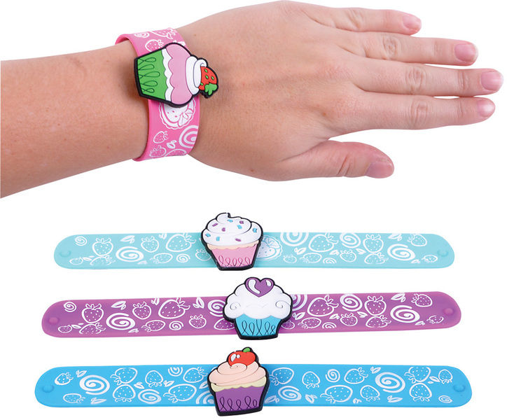 9" Cupcake Slap Bracelet. This collection of slap bracelets features a variety of colors and designs, all with a removable cupcake charm. Mix and match. Straighten out the bracelet by pinching the ends, and then place it onto a wrist. It fastens instantaneously with a slapping action." Case Pack 12 Please note: If there is a color/size/type option, the option closest to the image will be shipped (Or you may receive a random color/size/type). BRAND : DDI PRODUCT_CODE : 097138769589 PRODUCT_CODE_TYPE : UPC