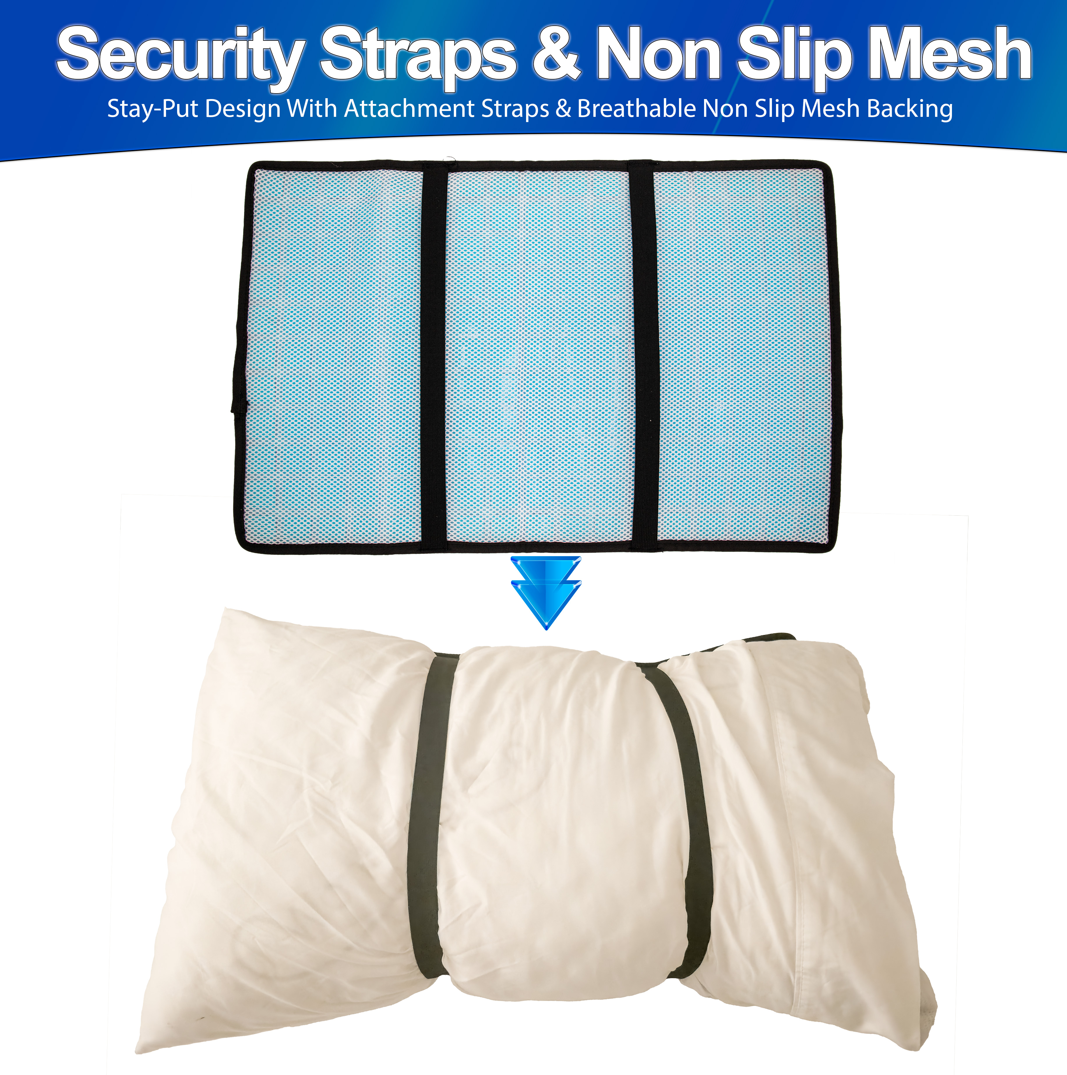 • • FLEXIBLE STRAPS SECURES TO PILLOW FOR UNINTERRUPTED SLEEP: No more adjusting or repositioning during the night. With our innovative flexible straps, the Cooling Pillow Pad remains firmly attached to any pillow type, ensuring consistent cooling and maximum comfort, leading to undisturbed sleep. Pillow cooling pad 2 straps also enable this to be rolled up securely for storage or easy travel.