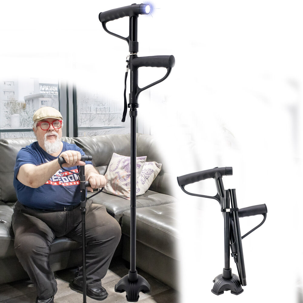 Folding Walking Cane with LED Light w/ Extra Rotating Support Handle, Lightweight, 4 Adjustable Height, Self Standing Quad Base, Comfortable Grip, Perfect for Elderly Senors and People with Limited Mobility