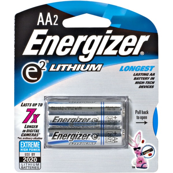 ENERGIZER AA HIGH ENERGYLITHIUM BATTERY - 2 PACK LITHIUM BATTERY - 2 PACK 2-pack Cardboard card for peg hook, re-closeable package Lasts up to 5x longer than alkaline batteries in digital cameras and up to 3x longer in other cameras and flash applications BRAND : ENERGIZER