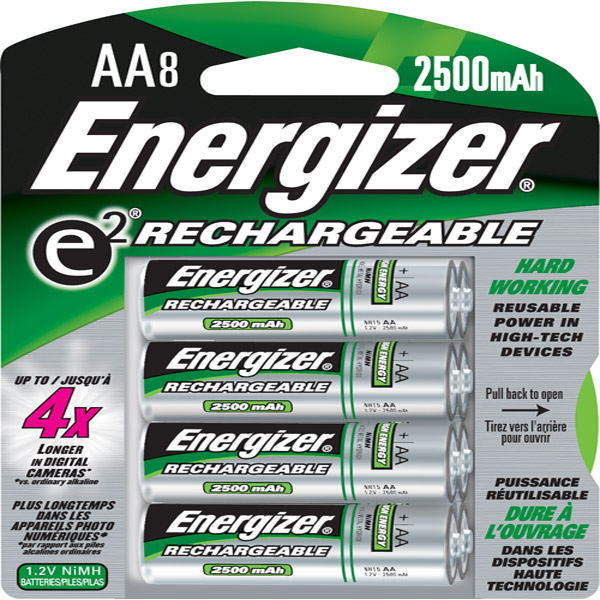 ENERGIZER RECHARGABLEAA 8 PACK AA 8 PACK 8 pack 2500mAhCardboard card for peg hook70% more powerCharges up to 1,000xBest for high-drain devices like digital cameras, CD players and hand-held gamesLifetime limited warranty BRAND : ENERGIZER