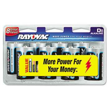 BATTERY SIZE : D BATTERY TYPE : ALKALINE BRAND : RAYOVAC COMPLIANCE STANDARDS : ANSI GLOBAL PRODUCT TYPE : BATTERIES-ALKALINE GREEN INDEX : N MATERIAL(S) : ALKALINE POST-CONSUMER RECYCLED CONTENT PERCENT : 0 % POST-CONSUMER RECYCLED CONTENT PERCENT : 0 % PRE-CONSUMER RECYCLED CONTENT PERCENT : 0 % PRE-CONSUMER RECYCLED CONTENT PERCENT : 0 % QUANTITY : 8 PER PACK RECYCLABLE : N TOTAL RECYCLED CONTENT PERCENT : 0% UNIT OF MEASURE : PK VOLTAGE : 1.5 V
