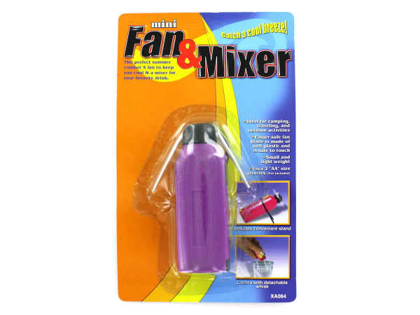 The all-in-one fan and mixer is the perfect summer combo! Item is a fan to keep you cool and a mixer for your favorite drink. Finger safe fan blade is made of soft plastic and is safe to touch. Ideal for camping, traveling and outdoor activities. Uses 2 "AA" batteries (not included). Includes a black plastic stand for convenience and a detachable whisk. Comes in an assortment of colors: red, green, orange and purple. Item comes in a blister card package. Measurements: 4" x 1 3/8" x 1". Case of 96 ADDITIONAL INFORMATION : ASSORTED COLORS BRAND : BULK BUYS COLORS : YELLOW,GREEN,RED,PURPLE,ORANGE,PINK MATERIALS : PLASTIC