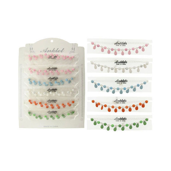 Beaded anklet with rhinestone accents, Silvertone chain,?and teardrop dangles. Assorted colors. Lobster claw clasp. Individually carded and poly bagged. Displayed six up on peggable card." Case Pack 60 Please note: If there is a color/size/type option, the option closest to the image will be shipped (Or you may receive a random color/size/type). Additional Details As we rotate stock, everything with an expiration date will have at least a 2 year shelf life (unless otherwise specified)null BRAND : DDI PRODUCT_CODE : NA PRODUCT_CODE_TYPE : UPC