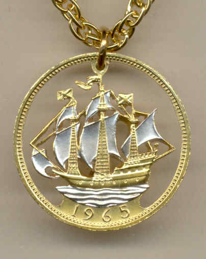 Real British penny (U.S. quarter size coins) in new un-circulated condition.First a small hole is drilled in the coin, then a very fine jewelers saw blade is inserted through the hole and worked around the coins design, (by hand) cutting away the background. Thus leaving the coins figure floating inside its outer edge (rim). The figure is then selectively layered (by hand) in Brilliant Gold & Silver. Each work of art comes complete, on 14K gold layered 18 in. rope chain and in a nice jewelry box. Warranty 90 days BRAND : J&J Coin Jewelry