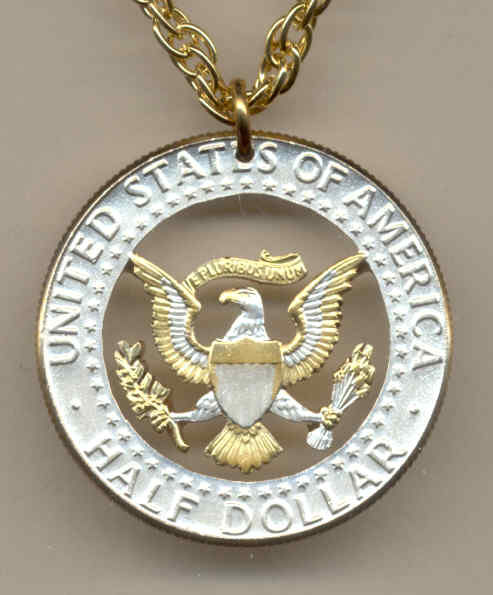 Real U.S. Kennedy (Eagle side) Dollar in extremely fine condition. First a small hole is drilled in the coin, then a very fine jewelers saw blade is inserted through the hole and worked around the coins design, (by hand) cutting away the background. Thus leaving the coins figure floating inside its outer edge (rim). The figure is then selectively layered (by hand) in Brilliant Gold & Silver. Each work of art comes complete, on 14K gold layered 24 in. rope chain and in a nice jewelry box. Warranty 90 days BRAND : J&J Coin Jewelry