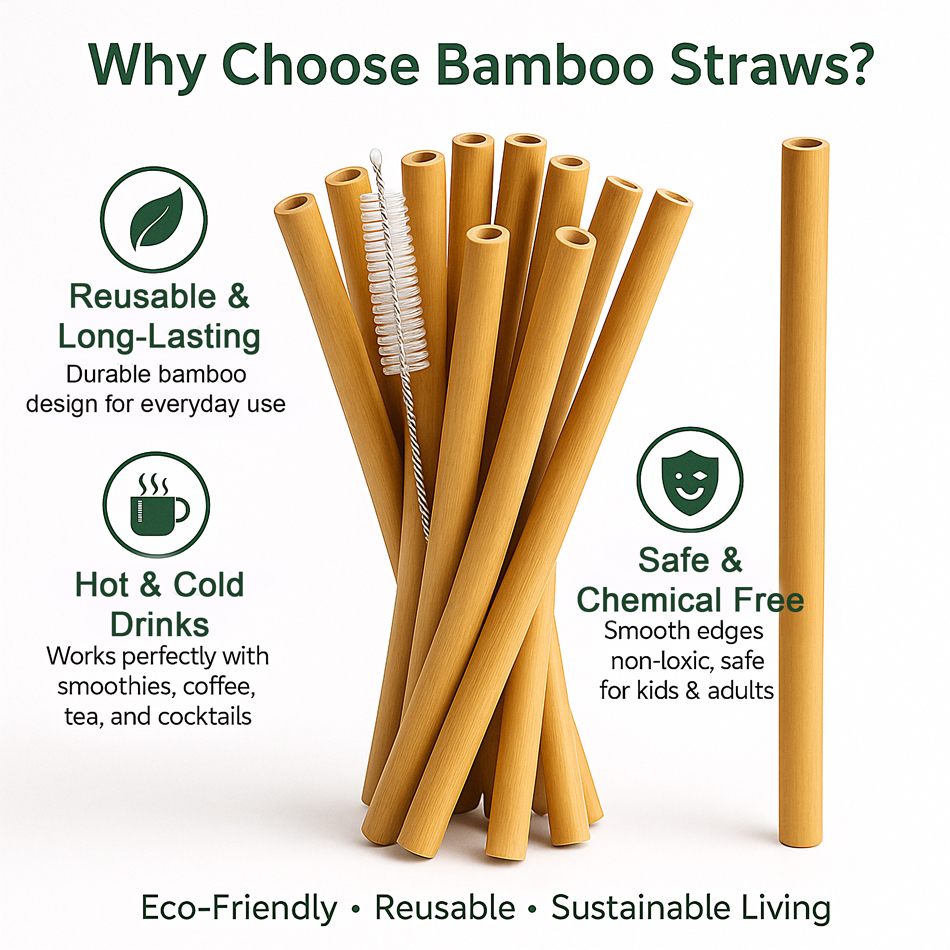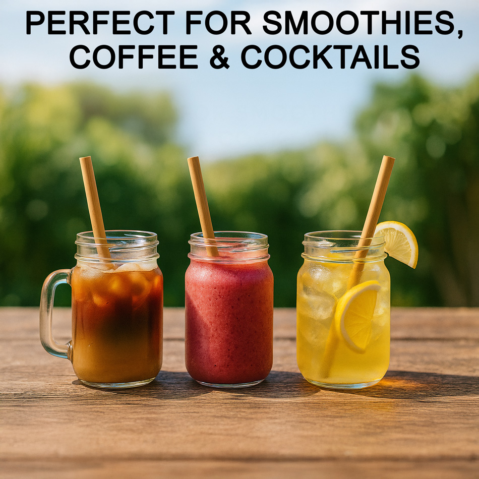 Eco-Conscious Bamboo Straws for Sustainable LivingDiscover the ultimate eco-conscious solution with our Natural Bamboo Straws with Cleaning Brush. These biodegradable and compostable drinking straws are crafted from 100% organic bamboo, offering a sustainable alternative to disposable plastic straws. Perfect for smoothies, juices, and cocktails, these lightweight and portable straws are designed to support your zero-waste lifestyle. Whether at home, on the go, or at your favorite cafe, these reusable drink accessories are a must-have for environmentally conscious individuals.Long-Lasting, Reusable, and Easy to CleanOur bamboo straws are built for durability and convenience. Resistant to splintering and staining, they are designed for long-term use with proper care. The included stainless steel cleaning brush with durable nylon bristles ensures thorough cleaning, making maintenance simple and hassle-free. Packaged in recyclable cardboard, this bamboo straw set aligns with eco-friendly principles, providing a practical and stylish way to reduce waste and embrace sustainable living.Elevate Your Beverage Experience with Natural EleganceEnhance your drink presentation with the natural charm of these organic bamboo straws. Their smooth texture and elegant bamboo finish make them perfect for parties, gatherings, or everyday use. Safe for both hot and cold beverages, these eco-friendly straws are ideal for families, children, and anyone looking to make a positive environmental impact. Enjoy your favorite drinks guilt-free while contributing to a cleaner, greener planet with these sustainable drinking accessories.
