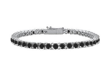 Brilliant-cut round black diamonds are prong-set in a sleek straight 925 sterling silver row with high shine rhodium plated. This tennis bracelet has a total weight (TDW) of 5.00 carat is secured with a safety clasp.