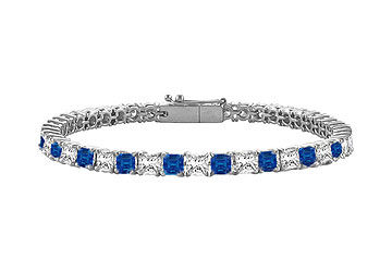 This never ending chain of alternating blue sapphires and princess-cut diamonds symbolizes your timeless love. Crafted in rich platinum held in a prong setting this tennis bracelet has a total gem weight (TGW) of 5.00 carats. A great way to honor your union.