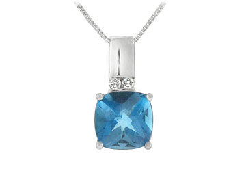 A square snowy blue topaz is attached with a 14K white gold bar. Two diamonds are set in between for a chic look. This pendant has a total gem weight (TGW) of 3.10 ct.