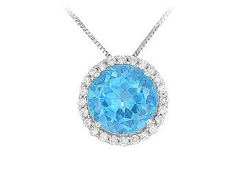 A large round snowy blue topaz is enhanced by round diamonds all around it. Made in 14K white gold it has a total gem weight (TGW) of 4.25 ct.