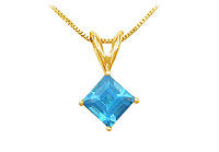 A square natural blue topaz is securely held in a luscious 14K yellow gold prong setting. This gemstone pendant has a total weight (TGW) of 1.00ct and comes with a standard 16 14K yellow gold chain.