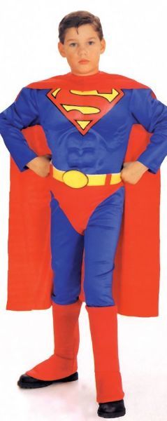 Red and blue polyester jumpsuit with 3-D muscle chest, red cape, and yellow vinyl belt. Children's Small fits boy's sizes 4 to 6." Sold Individually