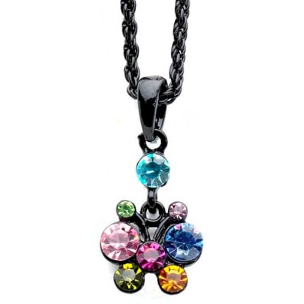 Butterfly Crystal Necklace. Made of Austrian Crystal Stones. Four Colors in a dozen bag. Necklaces are 18" long. Black Plated.