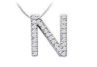 Twenty-seven brilliant-cut round diamonds are prong-set in a timeless classic letter N to wear your personality in a more simple yet elegant way. Made in 14K white gold this initial pendant has a total weight (TDW) of 0.45 ct.