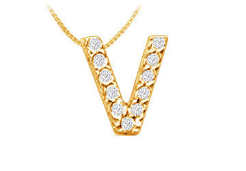 Eleven brilliant-cut round diamonds are prong-set in a timeless classic letter V to wear your personality in a more simple yet elegant way. Made in 14K yellow gold this initial pendant has a total weight (TDW) of 0.15 ct.
