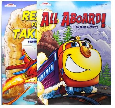 These wholesale coloring and activity books are 8"x11" in size and 96 pages. Ready For Take-off! airplane and All Aboard! train make up the 2-title PDQ assortment. Made in the U.S.A. 24 per case." Case Pack 24 Please note: If there is a color/size/type option