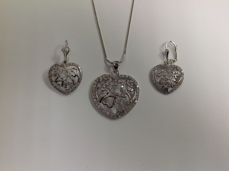 18" Necklace with Pendant and Lever-Back Earring Set Rhodium-Plated Heart-shaped with Round Cubic Zirconia in Gift Box