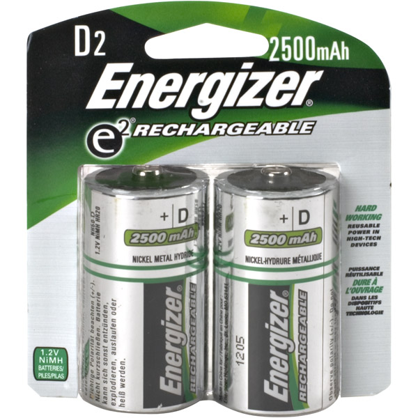 ENERGIZER D NIMHRECHARGBLE BATTERY - 2PK RECHARGBLE BATTERY - 2PK 2 pack 2500mAhCardboard card for peg hook70% more powerCharges up to 1,000xBest for high-drain devices like digital cameras, CD players and hand-held gamesLifetime limited warranty BRAND : ENERGIZER