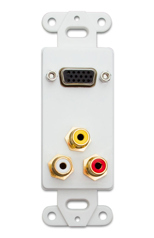 VGA + RCA A / V White Decora Wall Plate Insert, HD15 Female Coupler, 3 RCA Female Couplers. Additional Details Connection: VGA Female Port Plus RCA Composite Video/Audio Female Ports. Connection: VGA Female Port Plus RCA Composite Video / Audio Female Ports. Color: White. Weight: .1 lbs. BRAND : CABLE WHOLESALE COLOR : WHITE COLOR : WHITE