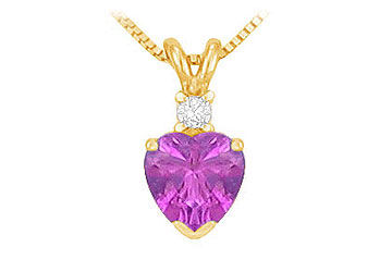 A heart-shaped natural amethyst is securely held in a luscious 14K yellow gold prong setting. Set atop a brilliant-cut diamond adds a touch of style. This gemstone pendant has a total weight (TGW) of 1.00ct and comes with a standard 16 14K yellow gold chain.
