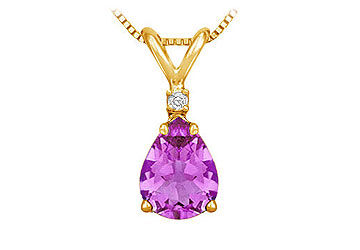 A pear-shaped natural amethyst is securely held in a luscious 14K yellow gold prong setting. Set atop a brilliant-cut diamond adds a touch of style. This gemstone pendant has a total weight (TGW) of 1.00ct and comes with a standard 16 14K yellow gold chain.