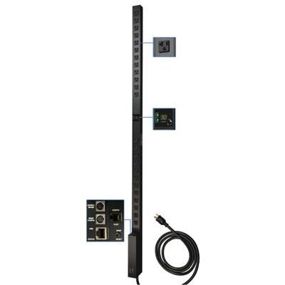 Monitored PDU systems support real-time remote monitoring via secure web, SNMP or Telnet interface and custom notification of user-specified remote conditions via email and SNMP trap. PDU power consumption in amps is displayed locally via front panel lighted digital display and can be monitored remotely to warn of potential overloads before critical IT mains breakers become overloaded. Advanced configurations support in-rack environmental monitoring with optional ENVIROSENSE temperature / humidity probe and rack access notification for up to 4 SRSWITCH or user supplied contact-closure sensors. Supports real-time monitoring of all reported functions with support for user-specified alarm and notification thresholds. Fully compatible with PowerAlert Network Management System Software, available via FREE download from www.tripplite.com PDUMNV30 Monitored 70 in. / 178 cm 0U vertical rack PDU supports 30A peak capacity at 120V (agency de-rated to 24 amps continuous). Includes attached L5-30P input cordset and 24 5-15/20R outlets. Visual and remote current monitoring tracks real time output current level. Supports 0U vertical rackmount installation with included mounting brackets. Toolless button-mount installation supported in compatible racks. Included cord retention brackets keep vital network equipment plugged in and continuously powered. 120V 30A peak capacity (agency de-rated to 24 amps continuous) Monitored Power Distribution Unit (PDU) with built-in web/network interface in 0U vertical rack form factor Includes attached L5-30P input plug and 24 5-15R outlets Supports local current metering and remote network monitoring of current, voltage and frequency via built-in web/network monitoring card Remote interface provides data regarding input power conditions and PDU load level via secure network or web browser interface Supports notification and logging of all major power events and user specified alarm thresholds Optional ENVIROSENSE temperature and humidity probe enables remote monitoring of environmental conditions and the ability to report conditions from up to four SRSWITCH or user supplied contact closure sensors DHCP/Manual configuration support provides the ability to have network settings automatically assigned to the card, or manually assigned via permanent IP addresses 10/100 Mbps auto-sensing allows optimal communication compatibility with your current 10/100 Base-T network Real-time clock backup maintains the time of day and date even if the PDU is shut down and unpowered Tiered access priviledges allow an administrator and a guest to log into the web browser for monitoring all PDUs Alert notifications via email or SNMP traps give users the added advantage of having an immediate event notification Protocols supported include HTTP, HTTPS, PowerAlert Network Management System, SMTP, SNMPv1, SNMPv2, Telnet, FTP, DHCP, BOOTP, NTP Front panel ammeter displays bank 1, bank 2 and total PDU power consumption (user selected via push-button switch) Included cord retention brackets keep vital network equipment plugged in and continuously powered 70 in. / 178 cm 0U vertical rack installation supported with included mounting brackets Toolless mounting supported in button-mount compatible racks Set of two 20A breakers protect two loading segments of 12 outlets each Optional PDUROTATEBRKT enables installation with rear-facing outlets for improved rack cooling and equipment access in button-mount equipped racks Applications Ideal for network configurations requiring a monitored PDU system Package Includes Rackmount PDU Plug retention plates Rack mounting brackets Owner's manual