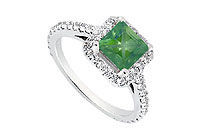 A square green emerald is prong-set in the center and is accented by smaller round diamonds all around it & on the sides too. Made in 14K white gold This ring has a total gem weight (TGW) of 1.00 carat.