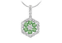 Scintillating with brilliant-cut round diamonds a geometrical hexagon figure is made in 14K white gold. Six round emeralds make a beautiful flower in this frame. This pendant has a total gem weight (TGW) of 1.50 ct.