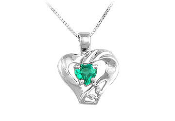 A heart shaped created emerald is prong-set in a 14K white gold heart. Two small round diamonds give a touch of style. This pendant has a total gem weight (TGW) of 0.50 ct.