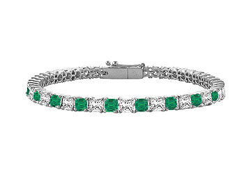 This never ending chain of alternating emeralds and princess-cut diamonds symbolizes your timeless love. Crafted in rich platinum held in a prong setting this tennis bracelet has a total gem weight (TGW) of 5.00 carats. A great way to honor your union.