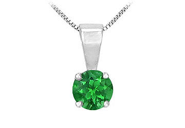A round natural emerald is securely held in a luscious 14K white gold prong setting. This gemstone pendant has a total weight (TGW) of 1.00 and comes with a standard 16 14K white gold chain. Available in yellow gold also.