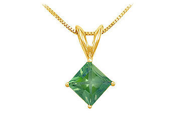 A square natural emerald is securely held in a luscious 14K yellow gold prong setting. This gemstone pendant has a total weight (TGW) of 1.00ct and comes with a standard 16 14K yellow gold chain.