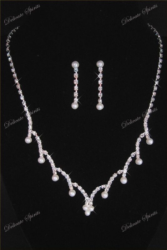Rhinestone White Raindrop Design Dangling Pearls Bridal Necklace Earring Set |